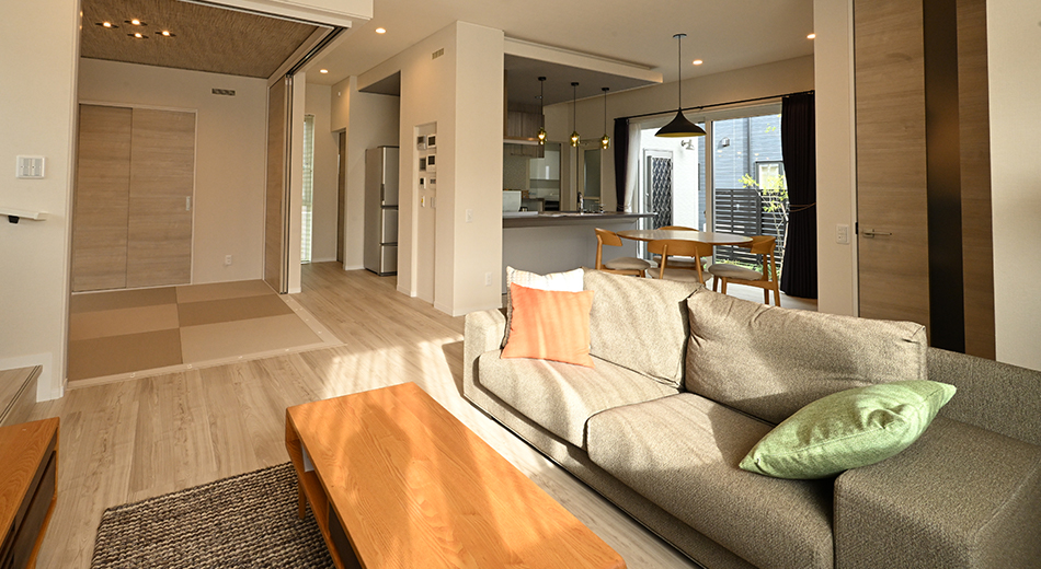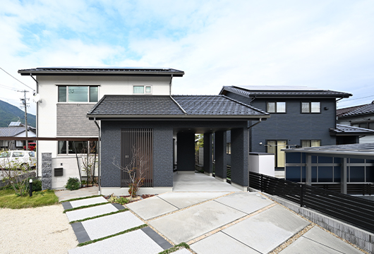 インナーガレージや手洗い水栓、リビングからの和室といった間取りの動線、大きな吹き抜けに、グレージュデザインなど、思い描いている理想の暮らしを、より身近に体感いただけます。